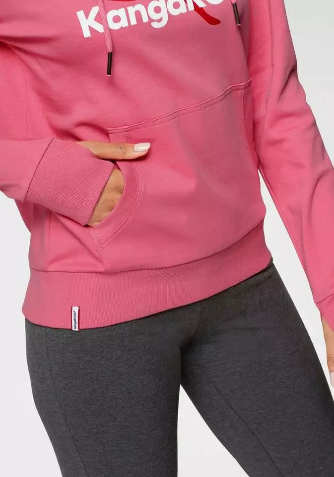 Schau dir den Hoodie von KangaROOS mal genauer an. Mit dem Aufdruck sieht er lässig und peppig aus. Eine Kapuze ist bei diesem Hoodie angesetzt. Die langen Ärmel enden in einem Rippbündchen, das für guten Sitz sorgt. Dieses Sweatshirt ist hüftlang sowie figurumspielend geschnitten, sodass der Oberkörper locker betont wird. Mit der Kängurutasche, die am Bauch aufgenäht ist, ist der bequeme Hoodie-Look komplett.