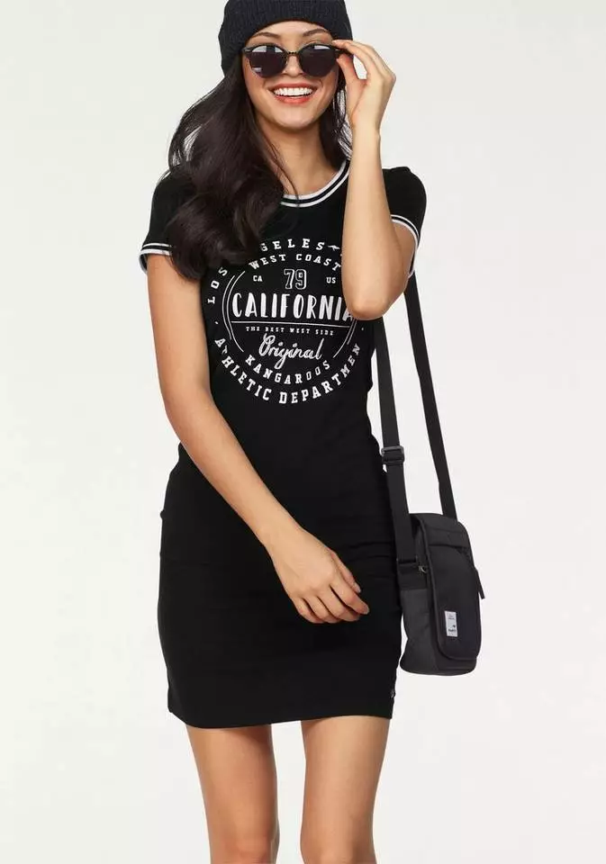 Sportiver Glamour? Und ob! Das Jerseykleid von Kangaroos setzt auf spannende Kontraste und lässt den Frontprint im Casual-Stil mit einem funkelnden Glitzern zur Geltung kommen. Gestreifte Bündchen an Ausschnitt und Ärmeln ergänzen das Shirtkleid um coole Anleihen aus dem College-Look. Der trageangenehme Baumwolljersey mit Stretchanteil bringt den figurbetonten Schnitt des Jerseydresses gelungen zur Geltung. Stilecht mit flachen Sneakers kombiniert punktet das Jerseykleid von Kangaroos als Basic mit modischer Raffinesse.