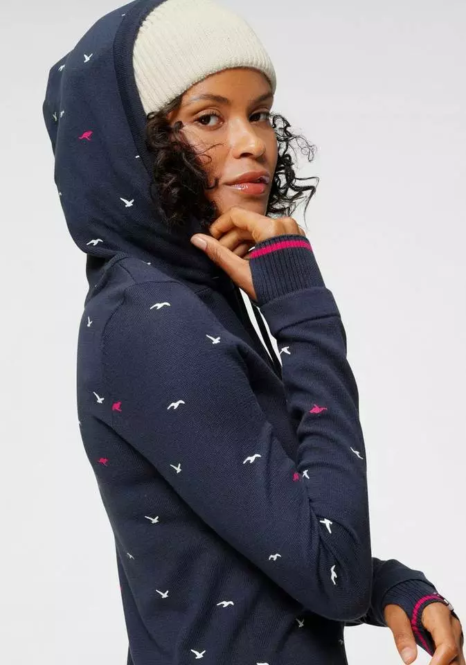 Du liebst sportlich coole Styles? Dann ist der Hoodie von Kangaroos bestimmt was für dich. Der Kapuzenpullover ist aus einer feinen Strickqualität gefertigt und bringt einen erfrischenden Alloverprint, durchsetzt von kleinen Logo-Details mit. Während die Kapuze über einen Tunnelzug in der Weite zurecht gezogen werden kann, haben dir die geringelten Rippbündchen der Ärmel praktische Daumenlöcher zu bieten. Der Pullover ist ein Oberteil für viele Looks, passt aber auch super mit dem passend gemusterten Jerseyrock zusammen. Einfach cool – der Hoodie von Kangaroos.