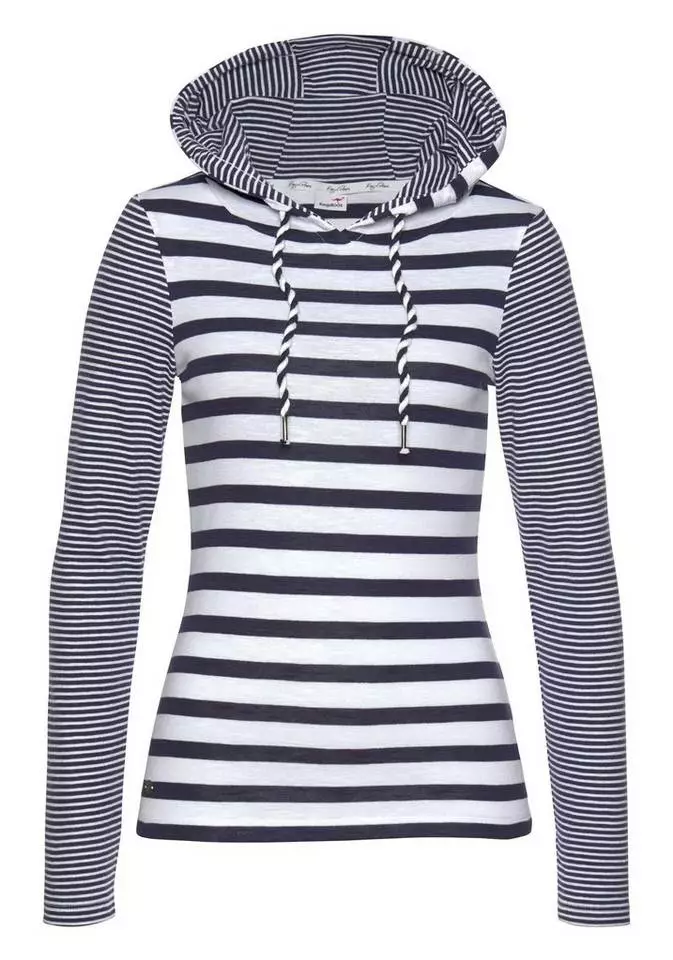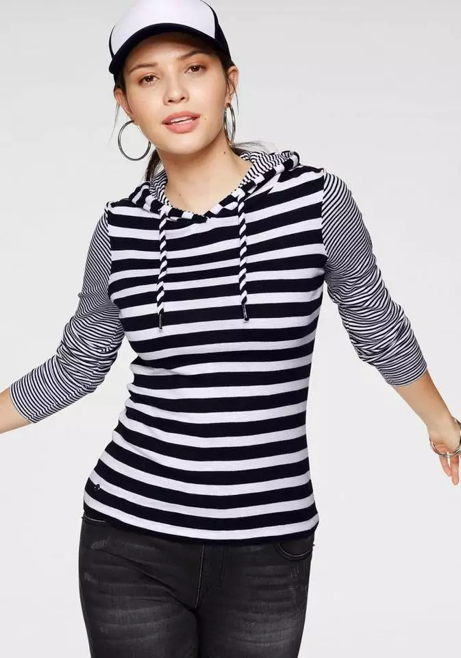 Zwei unterschiedliche Streifenmuster lassen das Kapuzenshirt von Kangaroos sportlich und cool zugleich wirken. Unterstrichen wird dieser Look durch die zweifarbige Kordel mit den kleinen Metallabschlüssen, die durch die Kapuze des Shirts gezogen wurde. Eine kleine Labelplakette über dem Saum und ein Patch auf dem Ärmel runden den modischen Style des Langarmshirts gekonnt ab. Besonders schön passt das Longsleeve aus einer soften Jerseyqualität zu Jeans und Sneakern. Aber auch zu einem Rock und Ballerinas sieht der leichte Hoodie einfach super aus. Für alle, die bequeme Mode lieben ist das gestreifte Kapuzenshirt von Kangaroos genau das Richtige!