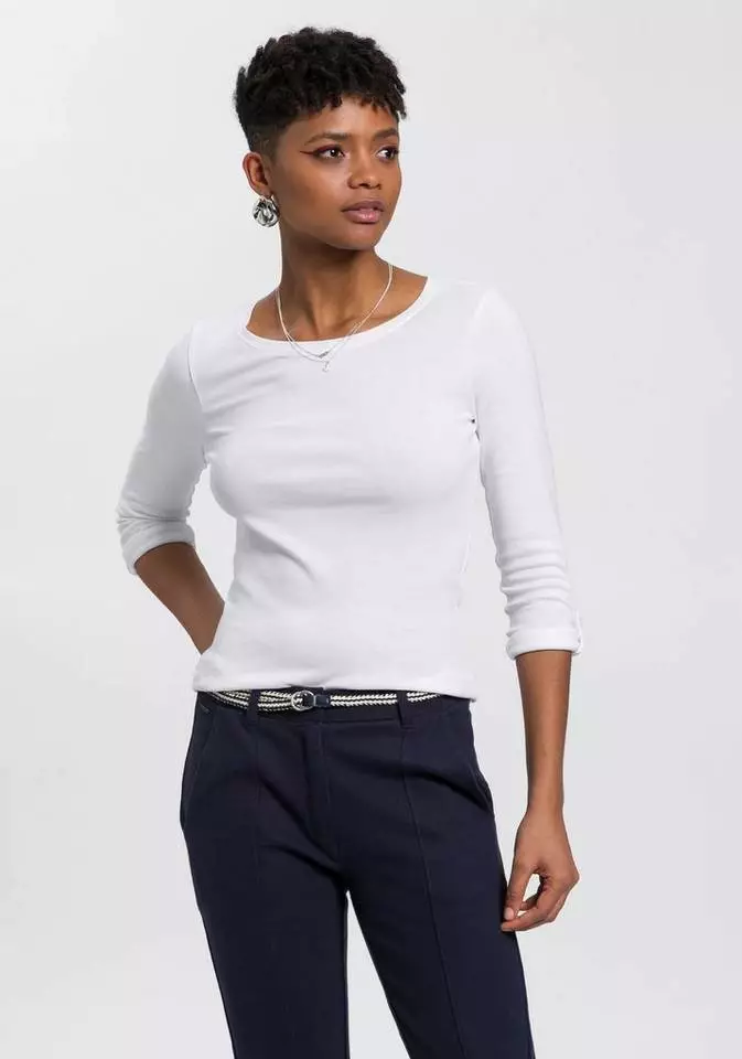 Der Basic-Trend geht mit dem Shirt von Kangaroos in die Verlängerung. Während der klassische Rundhalsausschnitt mit seinem schmalen Bündchen die typische Basicshirt-Optik erzeugt, sorgen die langen Ärmel mit ihrer Krempel-Option dank integrierter Knopfriegel für ein praktisches Gimmick. Außerdem lässt sich das komfortable Jerseyshirt so immer mal anders tragen. Markendetails in Lederoptik und Kontraststreifen entlang der Seitennähte setzen kleine Highlights in das cleane Design. Wer denkt Basics seien langweilig, der hat das Shirt von Kangaroos noch nicht gesehen.