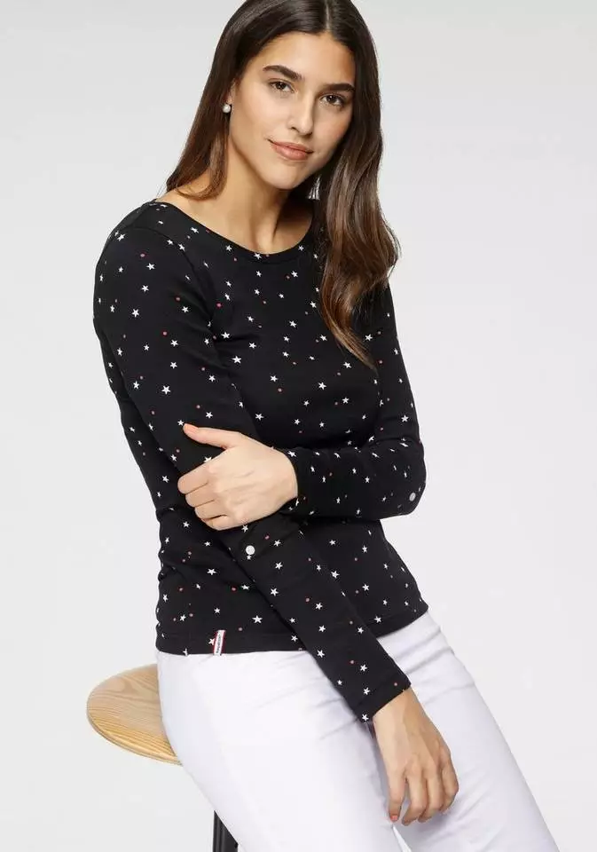 Kann man überhaupt genug Jerseyshirts haben? Wir sagen Nein. Mit dem Langarmshirt von Kangaroos erweiterst du deine Garderobe um ein tolles Printshirt. Schon auf den ersten Blick versprüht das schlanke Rundhalsshirt mit seinem Mustermix aus kleinen Motivprints femininen Charme. Die Krempelärmel mit dem kleinen Riegel setzen das verspielte Design des weichen Shirts konsequent fort. Egal, ob Freizeit oder Büro, das Langarmshirt von Kangaroos ist ab jetzt dabei.