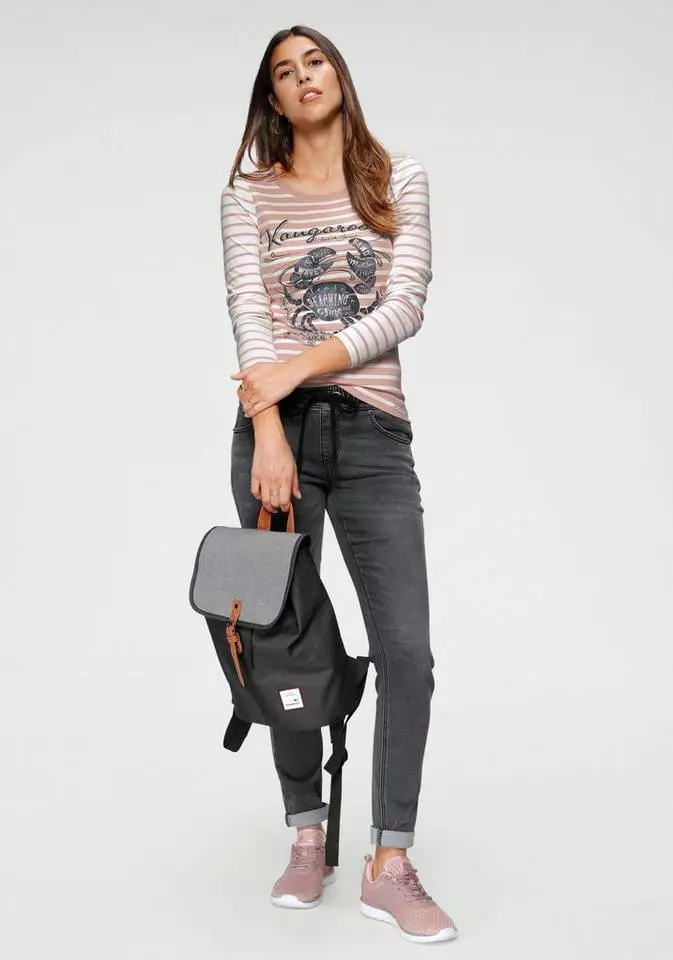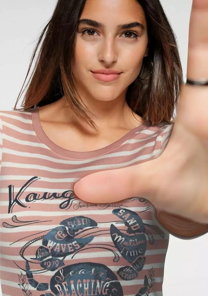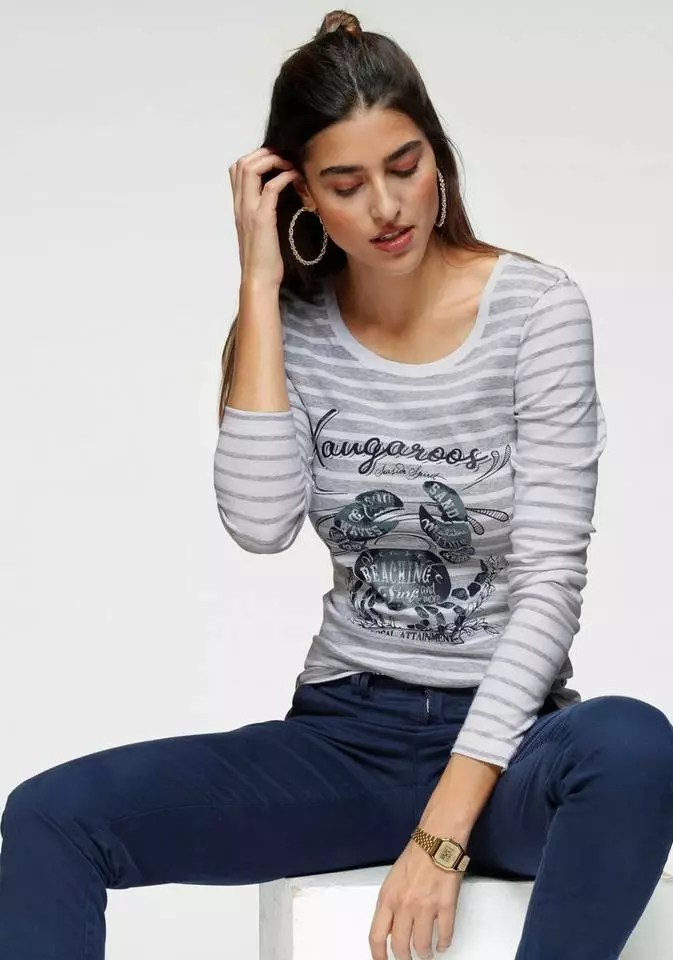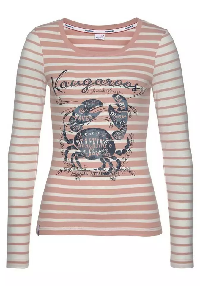 Ob am Meer im Hafen oder in urbaner Citylage – das Langarmshirt von Kangaroos versprüht eine frische Brise. Ein detaillierter Krabben-Frontprint und charmante Typo wird hier zum Blickfang. Mit weit-rundem Ausschnitt und geraden Saumkanten steht das Streifenshirt für charmante Lässigkeit und ergänzt Jeansrock, Used-Denim oder Chino. Angenehm hautfreundliches Ripp-Jersey aus reiner Baumwolle ist das Material der Wahl. Sorgt für maritimen Flair in deinem Kleiderschrank: das Langarmshirt von Kangaroos.