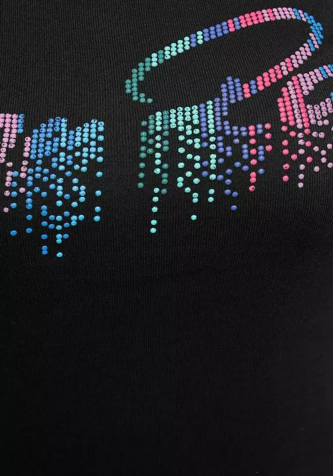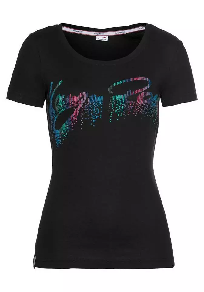 Mit dem Shirt von Kangaroos brauchst du nicht lange auf die Suche nach dem Regenbogen zu gehen – der schicke Markenprint in erhabener Haptik prangt quer über der Brust und schimmert farbenfroh. Ziernähte an der Seite des T-Shirts ergänzen den sportlichen Look harmonisch. Das flexible Rippjerseymaterial aus angenehmer Baumwolle betont die feminine Silhouette. Deine Lieblingsjeans und Sneaker sind die perfekte Begleitung für das coole Shirt von Kangaroos.