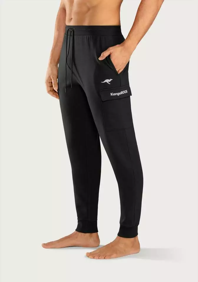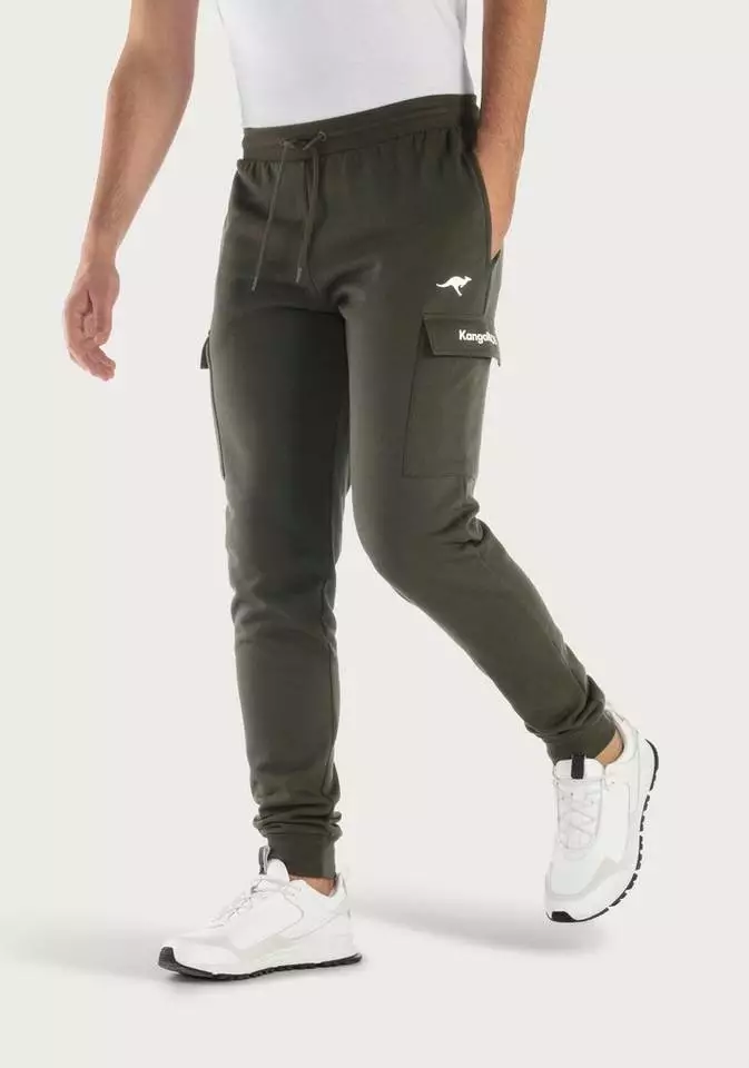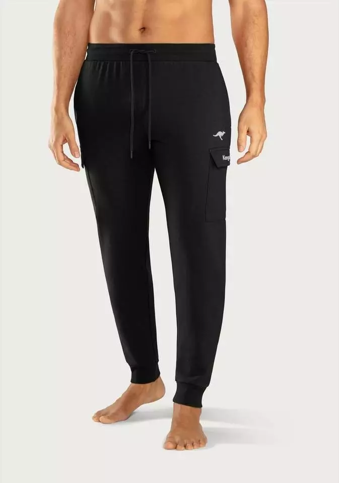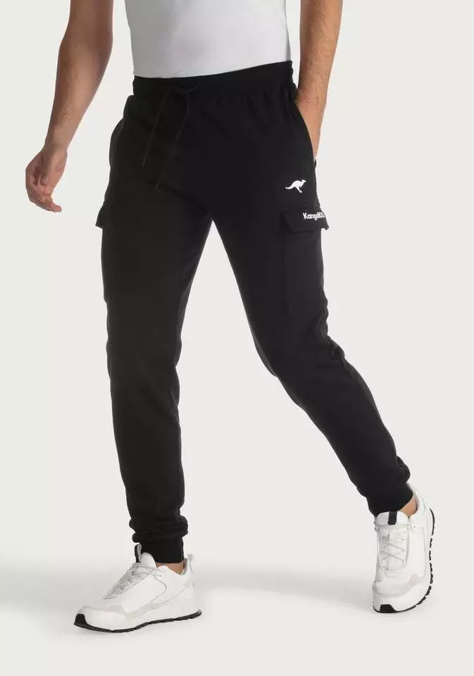 Du suchst nach Sweatwear, die zu Hause endlich so richtig bequem ist, aber mit der du auch problemlos draußen unterwegs sein kannst? Dann ist die Sweathose von Kangaroos mit den aufgesetzten Cargotaschen definitiv deine erste Wahl. Die Sweatpants kommen unten mit eng anliegenden Rippbündchen und oben an der Taille mit einem breiten gerippten Bund. Eingrifftaschen gehören ebenso dazu wie der in den Hosenbund integrierte Kordelzug und das klassische Känguru-Branding auf dem linken Oberschenkel. Das Material ist weich und wärmt angenehm. Ein Style für Couch wie Straße: die athletische Cargo-Sweathose von Kangaroos!