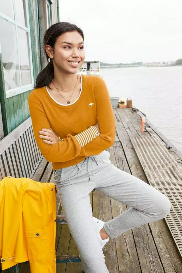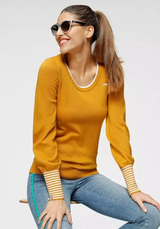 Softe Maschen mit Vintage-Touch. Ganz nonchalant verbindet der Pullover von Kangaroos einen lässigen Stil mit modisch charmanten Designelementen. Der Halsausschnitt ist rund und weit geschnitten, die Ballonärmel spielen mit Extravolumen und werden von langen, fein gestreiften Rippbündchen eingefasst. Ein Hosenrock oder eine weite Palazzohose mit Blockabsatz-Stiefeln ergänzen den weichen Feinstrickpulli perfekt. Lust auf femininen Strick mit dem besonderen modischen Kick? Der Pullover von Kangaroos verleiht deiner Garderobe ein trendy Style-Upgrade.