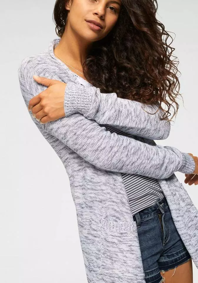 Die melierte Strickjacke von Kangaroos ist wie gemacht für legere Looks mit Kuschelfaktor. Die offene Silhouette mit gerollter Kante, die überschnittenen Schultern und das schöne Linksstrick-Muster unterstreichen den lässigen Charakter des lang geschnittenen Cardigans. Aufgesetzte Taschen vorn sowie breite Rippstrickbündchen an den Ärmeln und am Saum runden das Gesamtbild der Damenjacke charmant ab. Die lockere, bequeme Schnittführung und die weiche Strickqualität mit Baumwolle maximieren den Wohlfühlkomfort der verschlusslosen Jacke. Ein vielseitig kombinierbares Basic, das du am liebsten jeden Tag tragen möchtest – die längere Strickjacke von Kangaroos ist ein unverzichtbarer Begleiter!