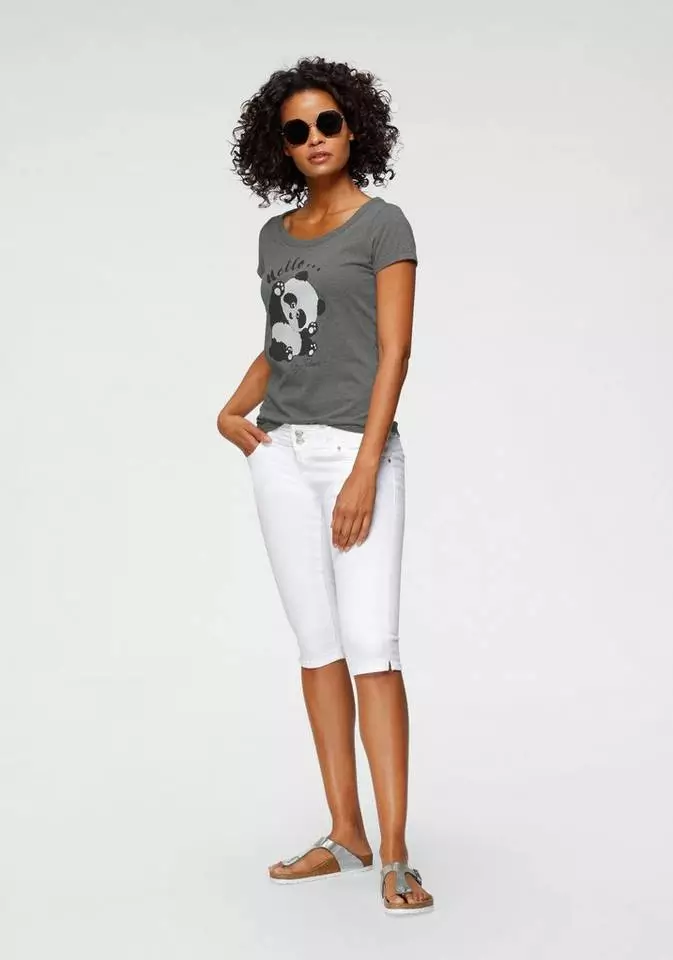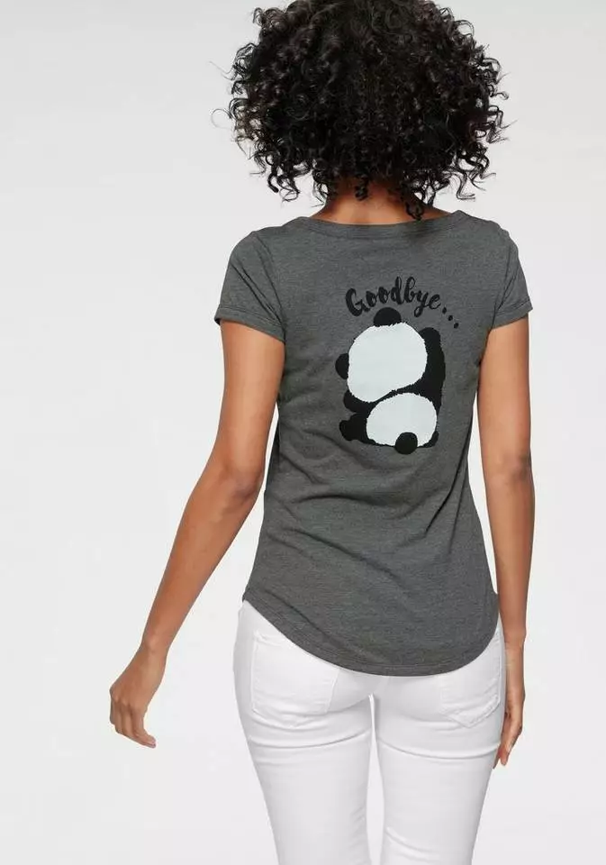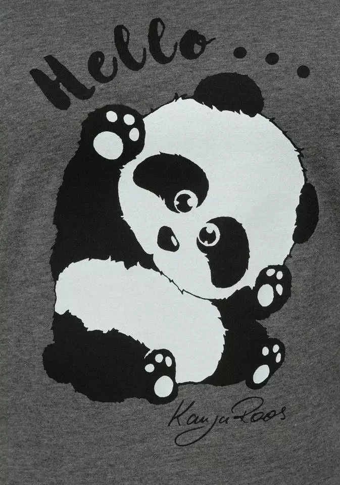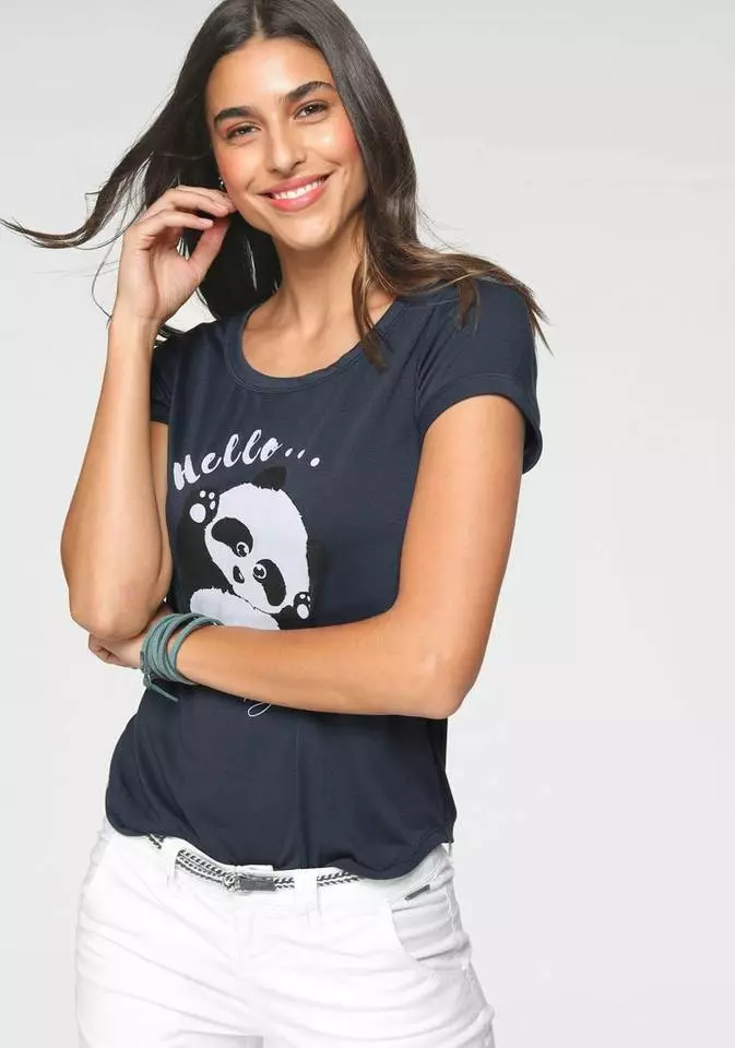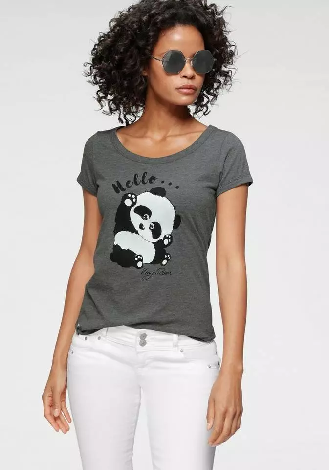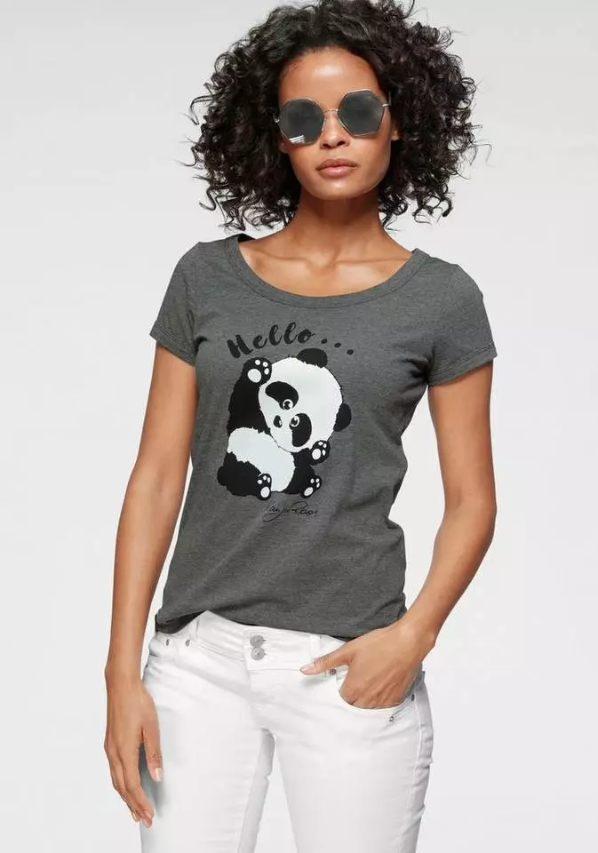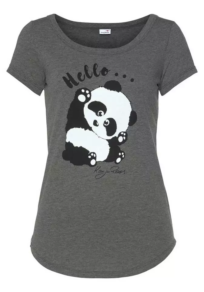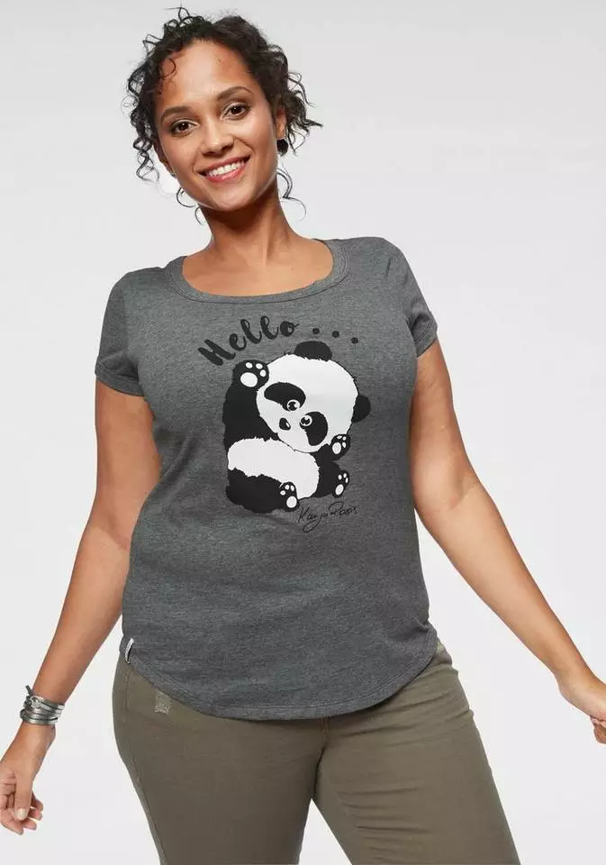 Ein süßer Hingucker ist dieses T-Shirt von Kangaroos. Originelle Highlights: der große Panda-Druck mit Statements auf Vorder- und Rückseite. Neben einer niedlichen Optik besticht das Kurzarmshirt dank elastischem Materialmix auch mit weichem Tragekomfort sowie einer locker antaillierten Schnittführung, die deine feminine Silhouette vorteilhaft umschmeichelt. Stilvoll abgerundet wird das Damenshirt von einem schönen Rundhalsausschnitt und einem gerundeten Saum. Tipp: Für ein unkompliziertes Easy-Styling kombinierst du das Printshirt zu Jeans oder Shorts und Sneakers. Setzt tierische Eyecatcher-Akzente im Alltag – das T-Shirt von Kangaroos ist ein echtes Lieblings-Piece und wird dich mit Leichtigkeit überzeugen!