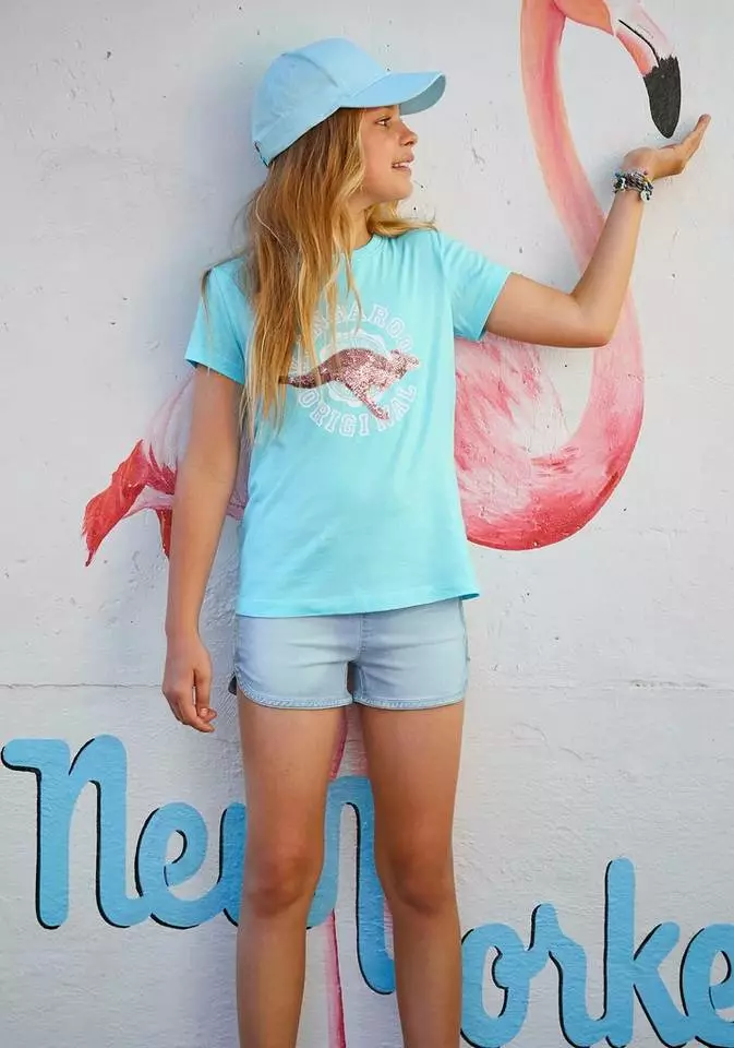 Das T-Shirt von KangaROOS für Mädchen sorgt sofort bei allen für helle Begeisterung. Warum? Sein Druck mit Paillettendetails liefert die Coolness, auf die deine kleine Prinzessin Wert legt. Da ist sie wie du, kein Wunder! Der taillierte Schnitt und der bequeme Rundhalsausschnitt verleihen dem weichen Jerseyshirt die klassische Casualnote. Einfach das Basic mit Skinny oder Rock kombinieren, Sneaker dazu und den Freundinnen zeigen – das T-Shirt von KangaROOS für Mädchen sorgt sofort für Furore!