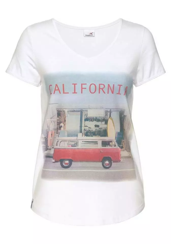 Cooler Print in XXL-Optik. Der Clou an dem T-Shirt von Kangaroos ist zweifelsohne das große farbenfrohe Druckmotiv auf der Vorderseite. Es macht aus dem Basicshirt mit dem V-Ausschnitt im Nu ein trendiges Printshirt. Ob eingesteckt oder offen getragen, die Kombinationsmöglichkeiten für das weiche Baumwollshirt sind schier endlos. Unser Tipp: Der taillierte Schnitt des Shirts ist wie gemacht für feminine Looks, zum Beispiel mit einem Minirock oder Denimshorts. Lass deinen Stylingideen freien Lauf, mit dem T-Shirt von Kangaroos.