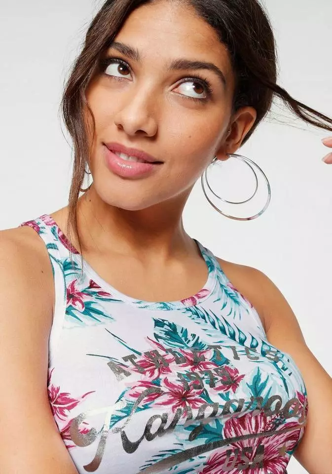 Sportliche Performance: Wenn du dein neues Top von Kangaroos trägst, kann in athletisch entspannter Hinsicht nichts mehr schief gehen. Das coole Tanktop kommt beim Sport oder in der Freizeit zum Einsatz, die pflegeleichte Baumwollqualität, aus dem das Shirt gefertigt ist, scheint wie gemacht dafür. Neben dem floralen Alloverprint gilt der aufgedruckte Schriftzug im Metallic-Look vorn als schmuckes Highlight des Oberteils. Nach dem Sport ziehst du einfach deine Kapuzenjacke über das Top von Kangaroos.